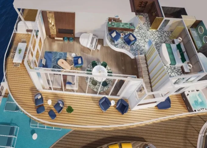 | OS - Owner’s Suite 61 m² + 17,5 m² balkón s výhľadom na more. 16,17. paluba vpredu. Max 5 osôb. Výhody Royal Suite Sky class. | 20 208 € 5 052 € za osobu | ||