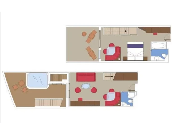 | YJD - Yacht Club Duplex Suite s vírivkou 46 m² + balkón 28-31 m². Vírivka. 2 podlažia, šatník, 2 kúpeľne (1 s vaňou). Max 4 osoby. 16. paluba. Cenový model MSC Yacht Club. Early booking | 8 871 € 8 871 € za osobu | ||
